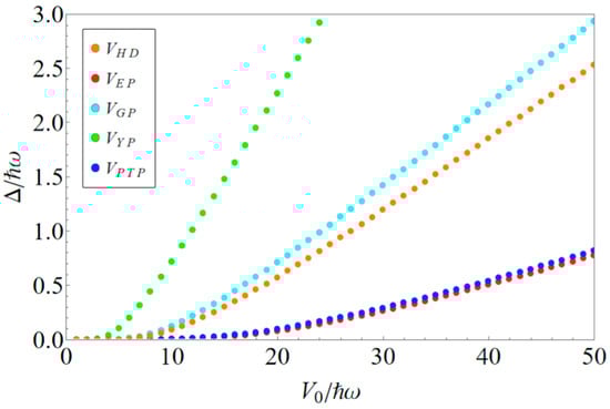 In Figure 3, we illustrate the behavior of the energy gap that appears as Cooper pairs are formed for the studied interaction potentials. The interaction range used in the case of the Yukawa interaction is β = 0.4, while β = 0.1 for all of the other potentials. We have considered positive values of V0 since, as concluded in the previous section, this election leads to diminish the pair’s energy and thus enables pair formation. As before, V0 is scaled with respect to the oscillator harmonic energy. For all of the interaction potentials analyzed, one observes that, starting from a particular value V0, ∆ acquires a finite value. In other words, an energy gap emerges as the interaction between two particles is tuned to be attractive, which is precisely the signature of Cooper pair formation. These findings agree with the results found in the previous section, where all of the model potentials lead to pair formation in non-homogeneous media. It is observed that the energy gap in the case of the Yukawa interaction exhibits the largest energy gap as V0 > 0. This result suggests that the Yukawa interaction represents the finest model to describe Fermi sea instability in inhomogeneous 2D systems. It is worth mentioning here that the phonon-mediated interaction between electrons in the original BCS theory has the form of a Coulomb interaction screened by an exponential term. Interestingly, a qualitative agreement between the energy gap and the potential depth in 2D (see Figure 3) and those found in 3D, also associated with finite-range potentials [50], can be clearly observed. The energy gap grows as a function of the potential depth.