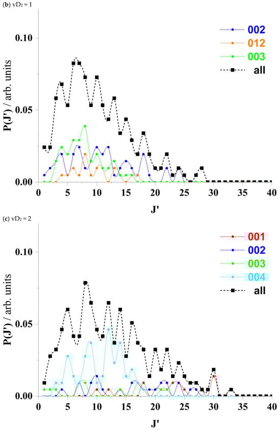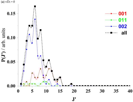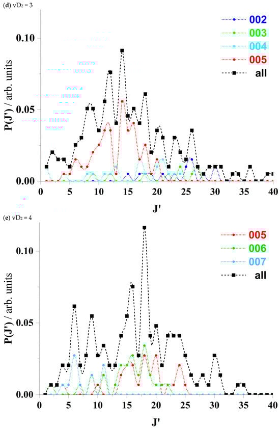 (a–e). P(J’) after a second selection, R–GB. P(J′) distributions are divided in 40 bin’s (J′ = 1,…, 40) and normalized to the unity the sum of the set of all probability distributions. The P(J′)(all) distribution is the sum of all possible distributions, P(J′)(vHO′, vHOD′, vOD′).