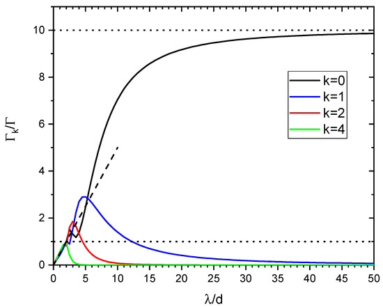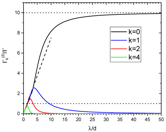 As expected, when becomes very large, the distance d between adjacent atoms becomes much larger than the wavelength , and cooperativity disappears. Ref. [14] investigated numerically a ring distribution of N atoms with fixed atom–atom separation d. In our case, the spectrum of the decay rate is a function of radius and of the number of atoms N. The distance d between adjacent atoms is , where the last expression is valid for large N. The previous necessary condition for subradiance, , implies . As discussed before, the sum in Equation (11) spans from to , where is determined by so that . Taking the most subradiant value (since subradiance occurs for ), then , and the only term surviving in the sum of Equation (11) is :