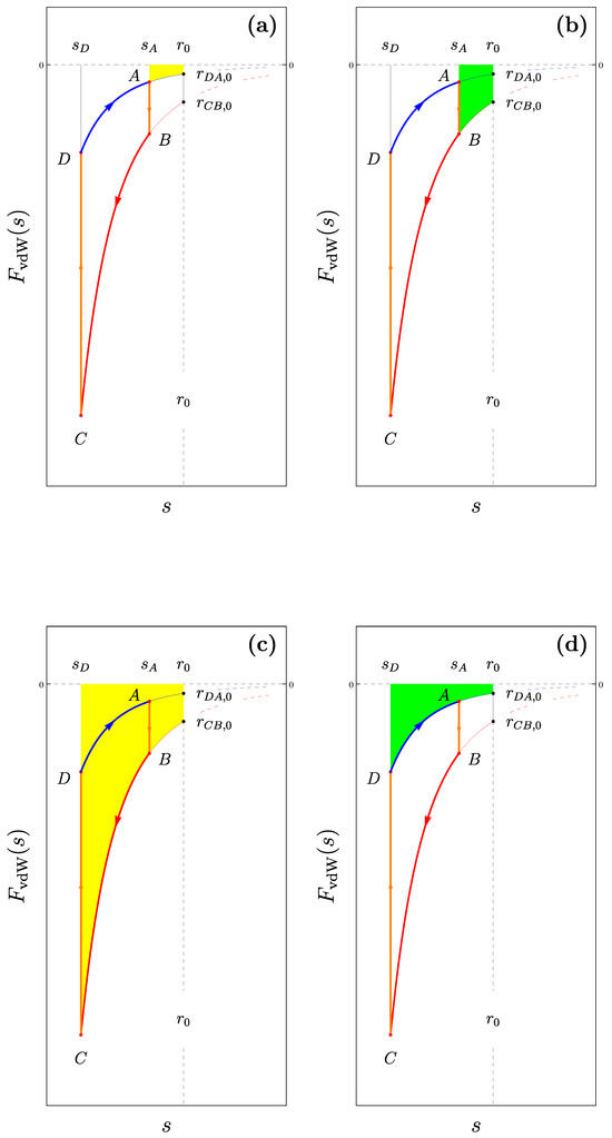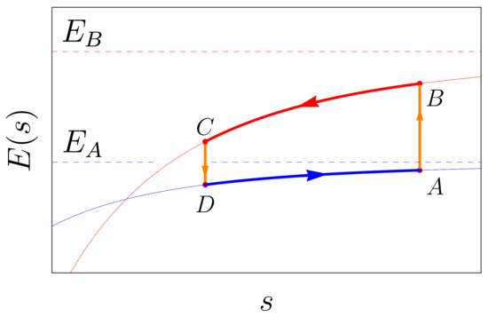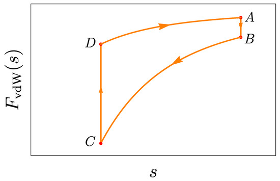 Let us reformulate the implementation of the Otto cycle (excluding the initial intake stroke) [120] presented in Section 3.1, leading to the violation of the First Law (Equation (2)). By paralleling that approach, one proceeds, for instance, by raising the energy of the movable system component, referred to as the ‘piston,’ by providing an amount of energy , isochorically; the piston is then drawn close to the fixed boundary so as to allow the dispersion force, presumed attractive, to do an amount of work ; then the piston releases the same energy received initially, , isochorically; finally the piston returns to its original distance from the fixed boundary so as to cause the dispersion force to do an amount of work . As already seen in Section 3.1, this approach implies that, at the end of the cycle, a finite amount of mechanical work was done by the dispersion force while no net energy was transferred to the system, thus violating the First Law of Thermodynamics (Equation (2)).