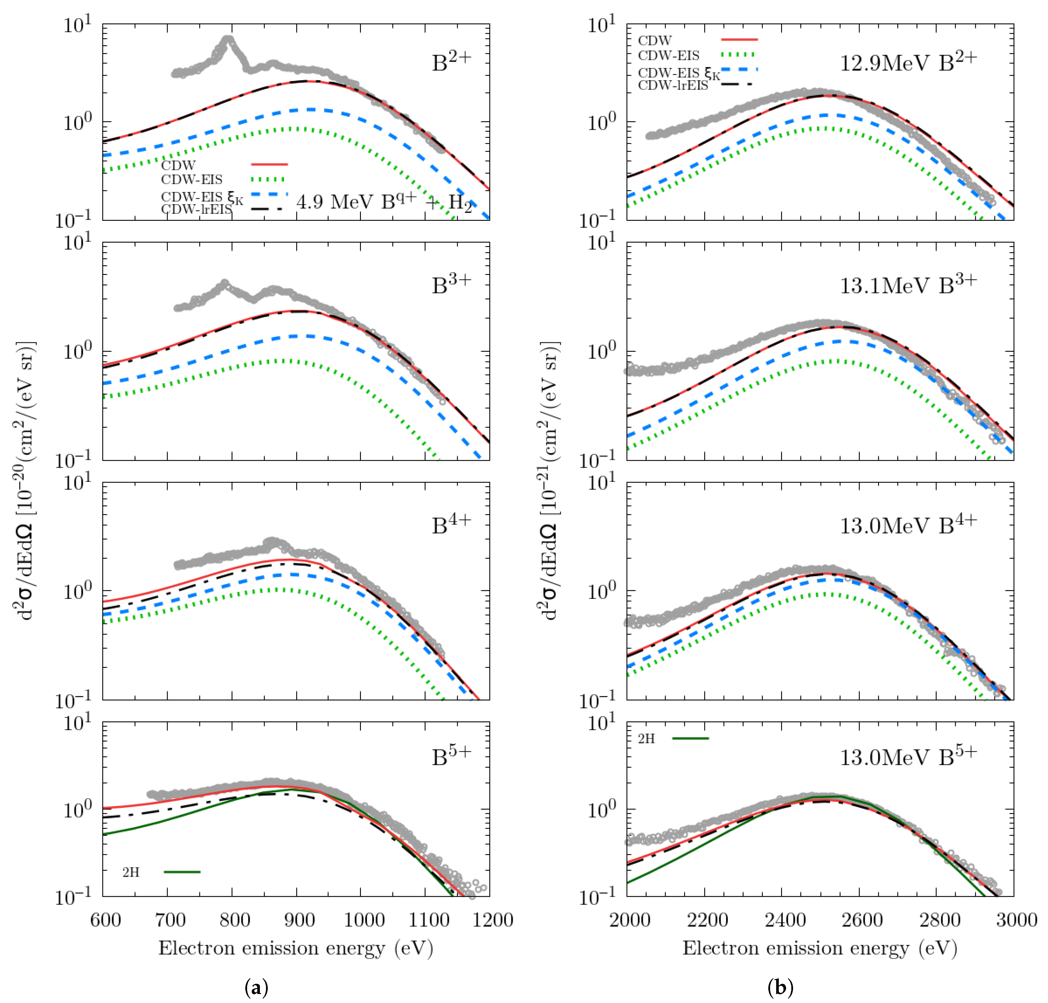 - Esponda, N.J.; Nanos, S.; Quinto, M.A.; Zouros, T.J.M.; Rivarola, R.D.; Benis, E.P.; Monti, J.M. Binary Encounter Electrons in Fast Dressed-Ion-H2 Collisions: Distorted Wave Theories and Experiment. Atoms 2023, 11, 17. [Google Scholar] [CrossRef]