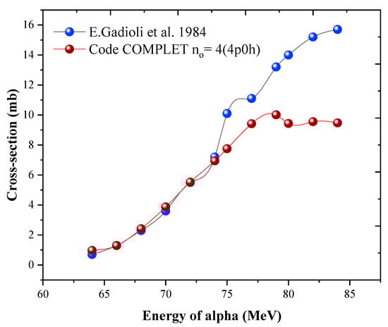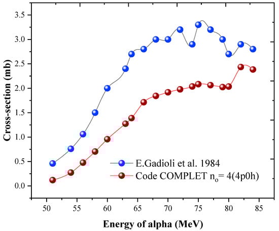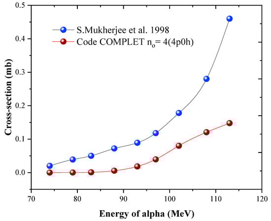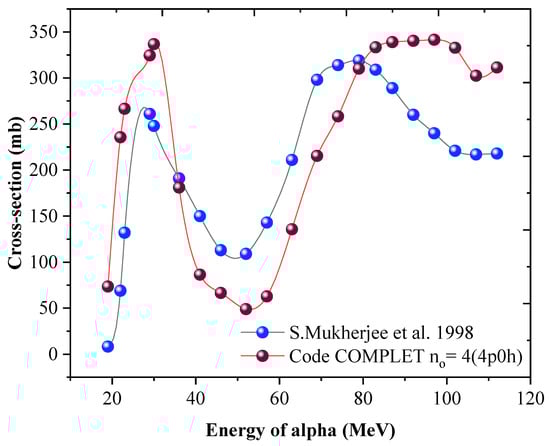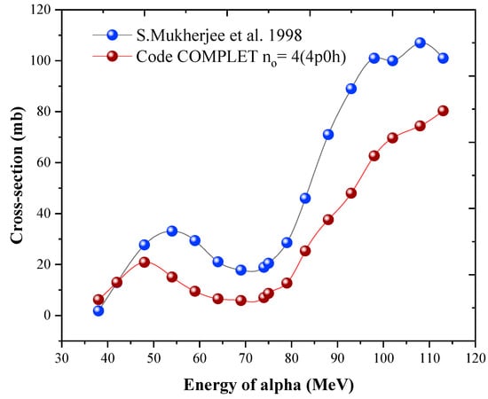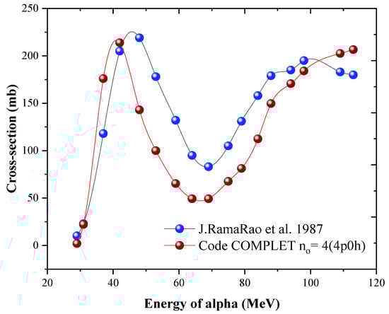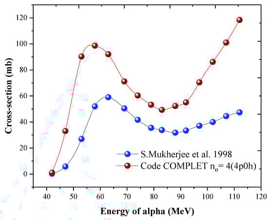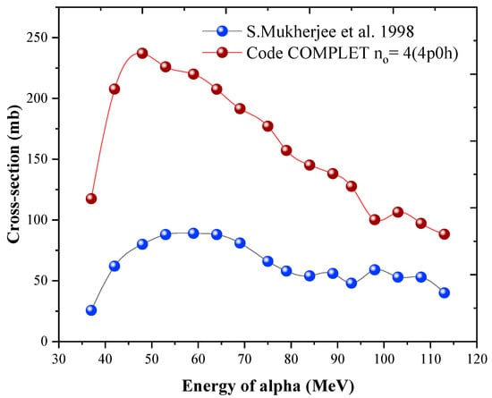 This study compared theoretical computations generated by the COMPLET code with experimental data obtained from various authors through the EXFOR library [16,17,18,19]. The current study can be divided into two categories: one involving alpha particles alongside nucleons in the exit channels, and another that includes only nucleons in the exit channels. Several authors [20,21,22,23,24,25] explain pre-equilibrium processes on exciton models. They calculate particle emission rates by applying reciprocity to the ejectiles under consideration, rather than the entire system. This approach works well when only nucleons are considered, as their presence within nuclei is generally accepted, and there is solid theoretical guidance regarding their behavior. However, when it comes to clusters, there is a lack of information about their pre-formation and behavior within the nuclei based on a priori knowledge. The predictions made by the COMPLET code exhibit different levels of consistency when compared to the experimental data.