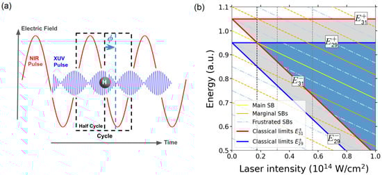 associated with absorption of a single photon from HH, with a frequency of , together with the additional absorption or emission of (|n|) fundamental photons at frequency for or , respectively. The resulting maxima at the energies given by Equation (16) correspond to the SBs in the PES of the HH in the presence of the fundamental laser [29,30,39,42], and they are also the SBs formed by the laser-dressed train of pulses composed by HH and HH. In fact, when the number of cycles of the NIR , the intercycle factor satisfies the energy conservation. When the pump pulse has a finite duration (approximately ), the sidebands are no longer infinitely sharp but instead exhibit a width ∼. This satisfies the uncertainty condition , with representing the pulse duration. In Figure 1, we have depicted the corresponding SBs as a function of the intensity of the NIR laser, which results in straight lines of negative slope . One can observe that their energies are straight lines, since the ponderomotive energy increases proportionally with the NIR laser intensity. In Figure 1 we can observe the SBs’ values given by Equation (16) for a combination of values of m and n.