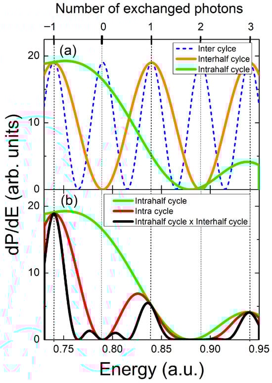 where the average action fulfills , with being a constant multiple of . When electrons are emitted perpendicularly, is not affected by changes in laser intensity, whereas in the parallel case it varies with field strength [29]. In Figure 2a we plot the interhalfcycle interference factor with the solid orange line. We observe that even values of exchanged NIR photons n are precluded, meaning that we can name even SBs as frustrated SBs. This characteristic applies not only to the RABBIT protocol, but also to LAPE and photoionization in the perpendicular direction [42,43,44,45]. In Figure 2b, through its modulation of the intracycle pattern, the intrahalfcycle interference factor ultimately governs the modulation of the total ionization probability. The small peaks at and correspond to the incipient SB with , which is suppressed by interhalfcycle interference. In Figure 2a we plot the intercycle factor as a function of the photoelectron energy for , showing the SB energy peaks of width and positions given by Equation (16). In Figure 2b, the intracycle interference pattern for and the total pattern for are shown using red and black lines. One can observe that the intracycle pattern for modulates the corresponding PES to This result was already observed for forward emission in the RABBIT protocol [29]. In the following, we point out the differences between forward and perpendicular emission.