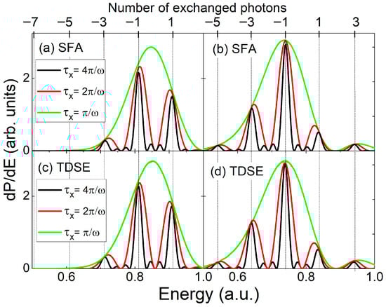 Figure 3 presents the SFA and TDSE results obtained using the same XUV and NIR pulse parameters as in Figure 2. We consider a.u. and two values of the NIR field amplitude: a.u. for panels (a) and (c), and a.u. () for panels (b) and (d). In all cases, the relative phases satisfy and . The agreement between the PES along the perpendicular direction calculated with SFA and TDSE is remarkable in RABBIT. This fact was already emphasized in Ref. [43] for the case of photoionization by a quasi-monochromatic NIR laser, where the two cases of perpendicular and parallel emission were compared and the reasons why the SFA works as well as it does for the parallel case were pointed out, and in Refs. [30,42] for the case of LAPE with only one XUV frequency. This complements their comparison with the SCM results in Figure 2b. Several conclusions can be drawn. First, The insignificant role played by the Coulomb potential of the remaining ion in shaping the electron yield is confirmed by the almost indistinguishable SFA and TDSE spectra. A more detailed analysis of Coulomb effects in RABBIT spectra will be presented in a forthcoming work. Second, the factorization of perpendicular photoelectron emission into either intra- and intercycle interference patterns [Equation (15)] or intra- and interhalfcycle interference patterns [Equation (26)] is validated not only in the SCM and SFA spectra but also in the full TDSE results. Figure 3 shows that the intrahalfcycle interference pattern—obtained from the energy distribution generated by an XUV pulse of duration (half a laser cycle)—modulates the intracycle interference pattern, which is obtained from the energy distribution corresponding to an XUV pulse with a duration of one full laser cycle, i.e., , as predicted in Equation (26). In the same way, the intracycle interference factor modulates the SBs in the energy distribution for a longer XUV pulse, i.e., . When the XUV pulse duration involves several periods of the laser, i.e., , the positions of the SBs in the SFA and TDSE calculations in Figure 4 agree with the SCM expressed in Equation (16) for an odd number of exchanged NIR photons, as described in the previous section. Conversely, SBs with an even number of exchanged NIR photons are suppressed by the destructive interference between XUV emission during the first and second half cycles of all the cycles of the NIR laser involved. The photoelectron spectra obtained from the SFA and TDSE calculations extend beyond the classical upper-limit energies predicted by the model, a.u. and a.u., and beyond the lower limits a.u. ( a.u.) and a.u. ( a.u.) for W/cm2 ( W/cm2) and a.u. ( a.u.).