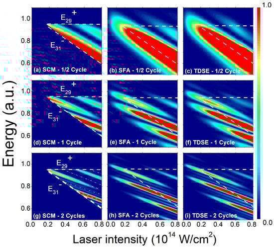 We further examine how the perpendicular PES varies with NIR laser intensity, following the schematic diagram in Figure 1. Figure 4 presents the energy distributions obtained using the SCM (a, d, g), the SFA (b, e, h), and the TDSE (c, f, i) for NIR laser intensities up to W/cm2 ( a.u.). The analysis includes different XUV pulse durations, , , and . Figure 2 and Figure 3 correspond to cuts of Figure 4 at W/cm2 and W/cm2. By definition, the classical boundaries and , shown as dotted lines, delimit the SCM spectra in Figure 4a,d,g. For (first row), the intrahalfcycle interference stripes exhibit a negative slope. For (second row), the intrahalfcycle interference patterns are flanked by nodes which arise at the zeros of the interhalfcycle factor appearing in Equation (26). i.e., for , which vanishes for , i.e., for all even number of exchanged NIR photons. The slope of maxima (visible SBs) and minima (frustrated SBs) is where the intensity units are in W/cm2 and the difference in energy between consecutive maxima (as well as minima) is . This result is inherent to all emissions in the perpendicular direction to the polarization of the laser fields, not only for RABBIT and LAPE but also for one-color ionization [43,44,45]. For (third column), the sidebands become thinner due to the time–energy uncertainty relation , which reflects destructive intercycle interference for energies far from conservation values. The SCM successfully recovers the negative-slope intrahalf- and intracycle interference stripes observed in the SFA and TDSE spectra, but only within the classical energy bounds and (see Appendix B). The quantum SFA and TDSE spectra naturally spread beyond these limits because of quantum diffusion. We have checked the convergence of our TDSE code and found that it deteriorates abruptly for intensities greater than W/cm2. For W/cm2 (not shown), the loss of the continuum wave function relative to the ionization probability is as high as 14% due to absorption in the numerical box, whereas for W/cm2, it was 7%. For W/cm2, it was 2%, whereas for or W/cm2, it is as low as 0.24%.