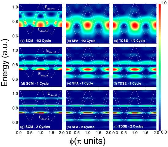 To test the general result that the ionization probability for photoelectrons emitted perpendicular to the polarization axis of the XUV pulse train and the NIR laser can be factorized in two distinct ways—either into intracycle and intercycle interferences [Equation (15)] or into intrahalf- and interhalfcycle interferences [Equation (26)]—we compare the photoelectron spectrum as obtained from the SCM, the SFA, and ab initio TDSE simulations. The NIR and XUV frequencies are taken as a.u. and , respectively, with and 15. We consider the NIR laser duration to be , corresponding to four optical cycles, and three different durations of the XUV pulse train, , , and , corresponding to , and 2 optical cycles of the NIR laser, all of them starting right after the second cycle of the NIR laser, saving the first cycle for a linear ramp on and the fourth cycle for a linear ramp off. The envelopes are defined in the same way: a unit-amplitude flat-top with one-cycle linear ramps on and off.