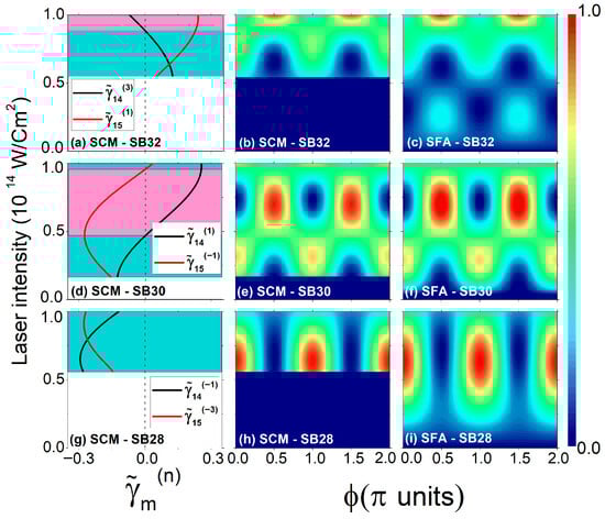 Finally, to scrutinize the phase delays of the sidebands as functions of the NIR intensity, Figure 6 shows the perpendicular photoelectron spectra of hydrogen for SB32, SB30, and SB28 within the SCM and SFA. The SCM reproduces all the main features of the SFA, except for SB32, which is out of the applicability region. At low NIR intensities, the distributions for SB30 and SB28 maximize at and , indicating that both sidebands are in phase, i.e., [see Equation (28)]. Conversely, SB32 peaks at and for low intensity, with an ensuing phase delay