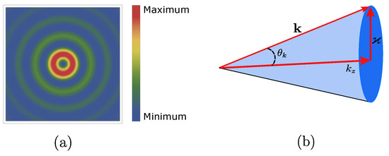 The expansion coefficient is given by , . Furthermore, the Bessel light beam can be described as a superposition of circularly polarized plane waves with helicity in momentum space, as seen in Equation (1). Moreover, the wave vectors of these plane waves with a constant transverse momentum and longitudinal momentum form the surface of a cone with an opening angle (see Figure 1b).