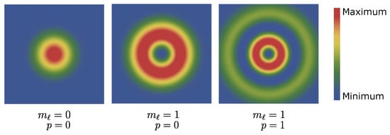 Laguerre–Gaussian modes [17] are solutions to the Helmholtz equation in cylindrical coordinates. In contrast to Bessel modes, they satisfy paraxial approximation [8]. LG modes are mainly characterized by two quantum numbers: projection of OAM and radial index p. As shown in Figure 2, the transverse intensity profile of the LG mode always consists of a number of rings. Moreover, by setting the projection of the orbital angular momentum , one can obtain the well-known Gaussian beam.