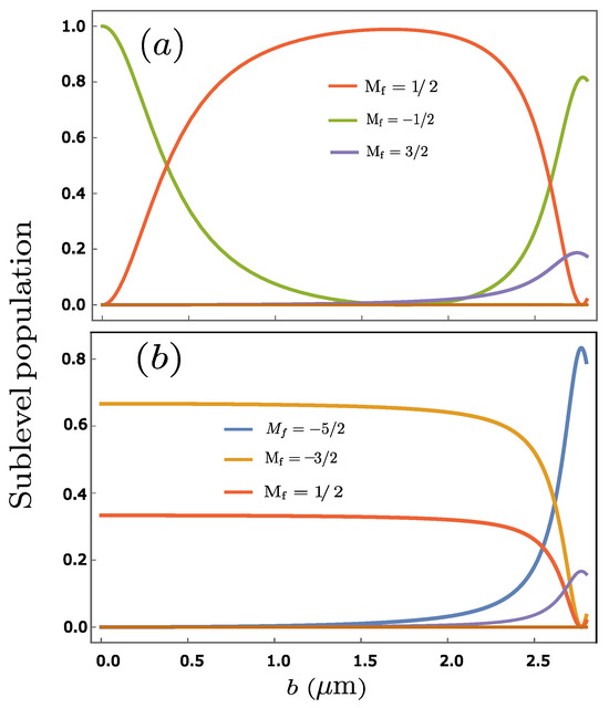 Relative sub-level population for the electric quadrupole transition in the Ca+ ion. The interacting light field is assumed to comprise (a) circularly and (b) linearly polarized Bessel beams of wavelength 789 nm, , . The ionic target is assumed to be prepared in the ground state and is displaced from the beam axis by b.