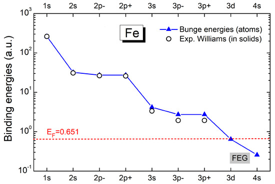 The theoretical binding energies of Fe are displayed in Figure 1. These values for are included in the SLPA-LM calculations for the inner shells given by Equation (6). It is worth mentioning that Bunge [38] calculations correspond to atoms (gas target), while we are interested in solid iron. For this reason, we also include in this figure the experimental binding energies in solids compiled in [41]. The agreement is good, except for the -subshell, for which the theoretical value is larger than the experimental one. No experimental binding energies are available for the and electrons in solid Fe. This fact is coherent with these electrons in the conduction band of the metal or with a minimal binding energy. To analyze this point, we include in Figure 1 the Fermi energy corresponding to four electrons in the FEG. This value is very close to the orbital energy given by Bunge [38].