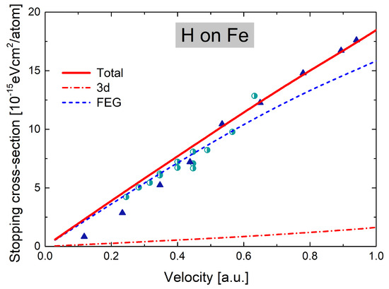 We calculated the stopping cross-section of H in Fe by considering the independent FEG, , and inner-shell contributions, as explained in Section 2. In Figure 2, the total electronic stopping cross-section, the FEG, and contributions are displayed as a function of the ion impact velocity for . The only experimental data for protons in Fe at these low velocities are the measurements by Arkhipov and Gott in 1969 [42], which are nicely described by the present total values. It can be noted that the FEG stopping cannot explain the data for , highlighting the importance of the contribution at such low velocities. In the theoretical experimental comparison, we also include the recent measurements in eurofer97 by the Uppsala group [33]. This comparison is based on Fe being the leading steel component. For , our results overestimate the experimental values in [33] by less than .