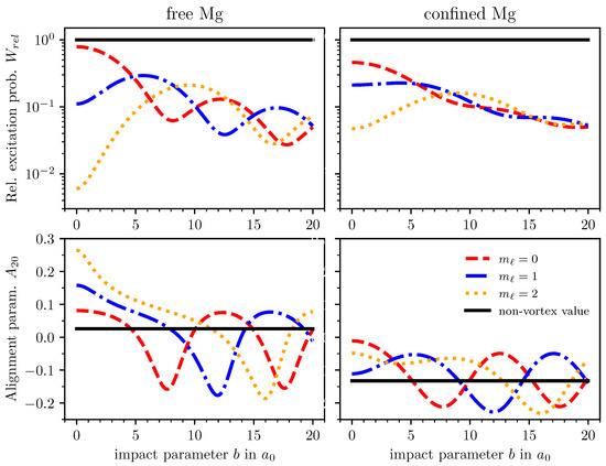 Having analyzed the total excitation probability, we now focus on the relative population of magnetic sublevels of as described by the parameter . This parameter is displayed in the lower row of Figure 2 as a function of b. As seen from these plots, exhibits oscillatory behavior similar to that observed for the relative total excitation probability. This can be attributed not only to the variation in the probability density profile but also to the orientation of the local linear momentum of the incoming vortex electron beam. By comparing the left and right bottom panels of Figure 2, we can also observe a remarkable effect of the confinement of the target Mg atom. In particular, while the alignment parameter is positive for a free atom and small impact parameters, for the confined atom and the entire b range. By inspecting Equation (7), we can conclude that excitation of the is enhanced compared to the other sublevels due to the screening of the target atom.