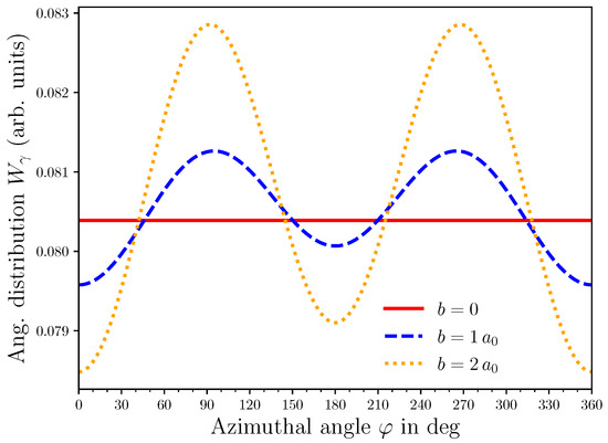 Apart from the alignment parameter , calculations were also performed for with , describing the coherence between the magnetic sublevels of the state. For the sake of simplicity, we will not present the results of these calculations here and turn to the discussion of the radiative decay (see Equation (8)). In Figure 3, we display this angular distribution for the confined Mg and as a function of the azimuthal angle , while the polar emission angle is fixed to . This particular polar angle corresponds to a typical setup of an energy-dispersive X-ray detector within a TEM. The calculations were performed for the incident Bessel electrons with kinetic energy 20 eV, opening angle and OAM projection . Moreover, the angular distribution in Figure 3 is displayed for the cases when the vortex line is displaced from the target atom by the impact parameter (red solid line), (blue dashed line), and (orange dotted line). For , the system exhibits perfect azimuthal symmetry, as the magnesium atom in its ground state is spherically symmetric, and the probability density of the electron vortex beam is also azimuthally symmetric. As a result, the subsequent decay is isotropic (see Figure 3). As seen from the figure, an increase in the impact parameter of the vortex electron results in an enhanced anisotropy in the angular distribution of the emitted photons. This behavior arises from the breaking of azimuthal symmetry of the system when the vortex line is shifted away from the coordinate origin that coincides with the position of the atomic nucleus. This broken symmetry leads to the predominant emission of photons in the plane, which is perpendicular to the shift vector (see Figure (Figure 1)).