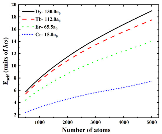 In the -plane, the angle in Equation (5) is always /2, which results in a dipolar interaction that is purely repulsive and isotropic. Thus, we have a system with only repulsive interactions present that is confined by a harmonic trap. In Figure 1a, we can see the density contours of this system. The repulsive impurity at the origin depletes the density there, which then concentrates in an annulus around the center. The contours are circular in shape, fitting with the isotropic nature of the interactions. In Figure 1b, a 1D cross-section of the density clearly shows the dip in the density at the center caused by the impurity. We show curves for three different impurities, in which we see minor differences in the density in the center, with the strongest impurity creating the largest decrease in the density, as expected. For the other impurities, both the depth and breadth of the density ‘divot’ are decreased. Also, as is typical of condensates, far enough away from the impurity (further than the healing length), there is no distinction in the density profile between the different impurities, in this case at approximately 2 μm from the center. In Figure 2, we plot the self-energy (Equation (1)) as a function of particle number for a few different impurity strengths. Unsurprisingly, the self-energy is higher for larger interaction strengths. With increasing particle number, it also increases and appears to scale linearly at large particle numbers. We have added another curve corresponding to 159Tb, an as yet unexplored element with a strong magnetic dipole moment, in order to display another curve for strength dependence.
