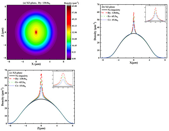 If the particles are confined to a plane parallel to the dipolar axis, then in Equation (5) can take any value and we have an anisotropic system that, roughly speaking, should be attractive along the z-axis and repulsive along the x-axis. The density contours of this system can be seen in Figure 3a. The shape is no longer circular, as the contours are elliptical with the major axis along the z-axis. The dipoles preferentially line up along the z-axis in order to keep their preferred head-to-tail configuration. Since the trap is isotropic, this is the natural shape caused by the interactions within the gas. This can also be seen in Figure 3b,c, which show the 1D density cross-sections along the x- and z-axes, respectively. Looking at the spatial extent of these cross-sections, one clearly sees that the z density extends to larger values from the origin than along the x-axis. The overall extent is much smaller in the case, which can be seen from the boundaries of the plots. The repulsive character of the system forces the particles to spread out more and thus form a more dilute system overall, whereas the attraction present in the and the large concentration in the center caused by the impurity means the total system size is smaller in the case. The density of the system does not drop to what was the peak density in the system until about 4 μm from the origin.