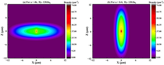 (a,b) Density contour plots for a system of 2000 Dy atoms confined in the -plane. Here, the confining harmonic trap has been deformed as described in Equation (2), and these results are for the most extreme deformations we considered, which are .