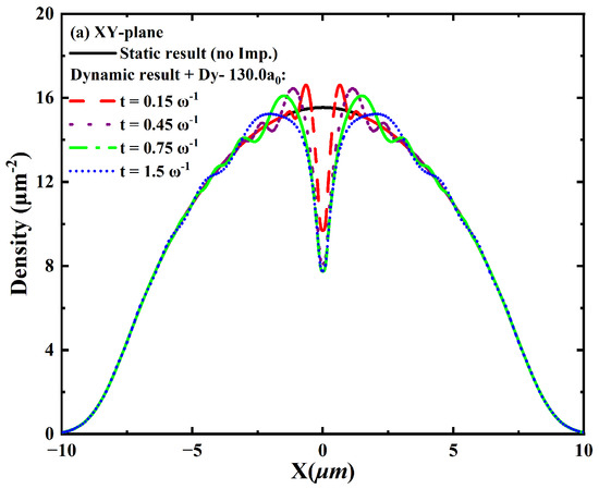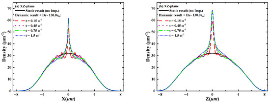 In the case of the -plane system (Figure 8), the depth and width of the central density minimum increases with time. The ripples increase in amplitude towards the center as they decrease over time. As in the case, the density ripples extend far outside the region where the static density profile differed from the no-impurity profile (about ±2 μm).