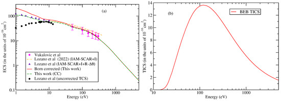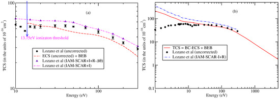 Lozano et al. used a magnetically confined experimental system [35] to measure the total scattering cross sections (TCS) up to 300 eV. Their experimental results showed good agreement with the independent atom model (IAM)-based screened corrected additivity (SCAR) models, which included interference (I) effects (IAM-SCAR+I) and rotational (R) terms (IAM-SCAR+I+R) [36,37,38].