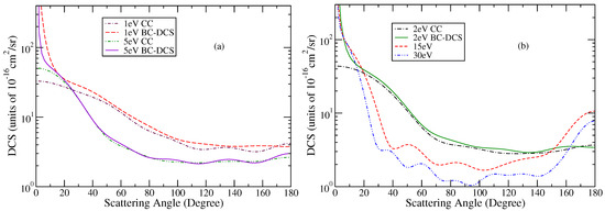 Here, is the Legendre polynomial, is the scattering angle, and is the scattering coefficient [54]. The quantities denoted with superscript B are evaluated within the Born approximation. is the maximum number of partial waves up to which the second term of Equation (9) is expanded. The rotationally summed DCS is obtained from the sum of DCS for each rotor state.