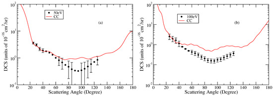The results at 50 eV and 100 eV are compared with the experimental results of Vukalović et al. [39] in Figure 4a,b. The overall shape and trends of present results are similar to Vukalović et al. except that the SCE-DCSs are oscillatory and higher. The oscillatory behaviour has been observed in several molecules that employed POLYDCS code for scattering calculations [24,61]. This behaviour is due to the lack of complete convergence of higher partial waves accounting for the dipole potential term in the Born closure method. The higher DCS results may be due to the omission of inelastic channels, which may be strongly interacting with the elastic channels.