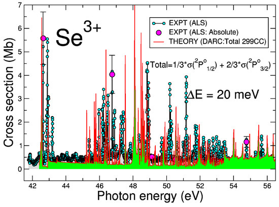 - Esteves, D.A.; Bilodeau, R.C.; Phaneuf, R.A.; Kilcoyne, A.L.D.; Red, E.C.; Aguilar, A. Absolute single photoionization cross-section measurements of Se3+ and Se5+. J. Phys. B At. Mol. Opt. Phys 2012, 45, 115201. [Google Scholar]