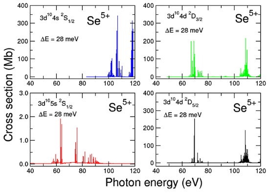 Atomic selenium and its ions have been detected in the spectra of white dwarfs [1,2,3], sub-dwarfs [4], metal-poor stars [5,6], and planetary nebulae [7,8], despite its cosmic rarity. The chemical compositions of these objects highlight details of stellar nucleosynthesis and the chemical evolution of galaxies. The uncertainties in the atomic data can lead to an abundance errors of a factor of two or more in astrophysical nebulae [9,10]. Low-lying energy levels of Ga-like, Zn-like, and Cu-like ions of selenium have been extensively studied both theoretically and experimentally for fusion science applications [11], but photoabsorption studies are severely lacking. Elaborate non-local thermodynamical equilibrium (NLTE) models of stellar atmospheres include numerous generally reliable bound–bound transition data—see, for example, for Se V [3]—but radiative (bound-free) cross-sections are approximated using hydrogenic models [12,13], when other sources of data, for example, the Opacity Project, are not available for an ion of interest. Benchmarked calculations of the photoabsorption cross-sections for Se IV, Se V, and Se VI, presented in this paper, are therefore applicable to improving stellar atmosphere models.