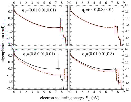 Eigenphase sum as a function of the electron scattering energy for different geometry configurations () of the HDO molecule (solid black lines) employed for the scattering calculations. For comparison, eigenphase sum for the same geometries are depicted for H2O (dashed red lines).