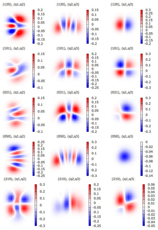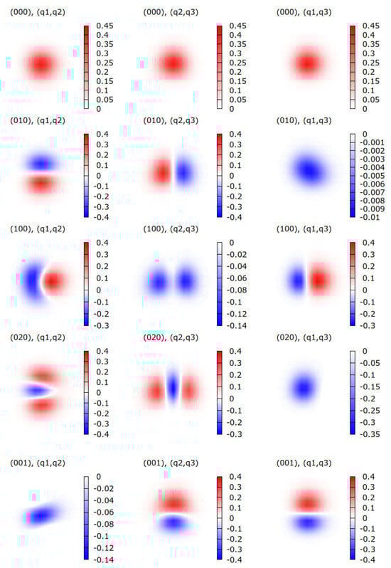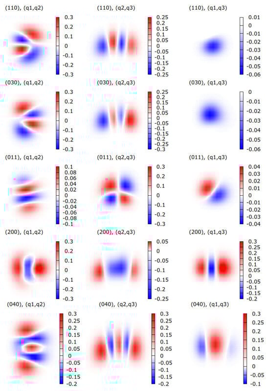 Table 3 shows that the wave functions of certain vibrational levels have a mixed character. For example, the wave functions of vibrational levels and seem somewhat similar due to the close coincidence between the and harmonic frequencies giving almost the same energy for both levels. This result can be confirmed by analyzing the wave functions displayed in Figure 2, Figure 3 and Figure 4. As depicted in the first two rows of Figure 3, the wave functions of levels and are indeed similar. Analogously, the wave functions of levels and or and are similar to each other, yielding to large values of , as stated in orange in the table. This behavior of the wave functions could be attributed to the anharmonicity of the H2O PES [22] employed in this study.