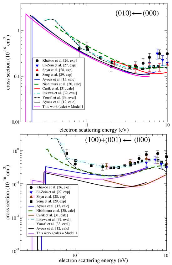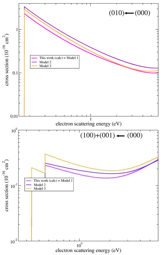 The figure compares the results obtained for the different models, Models 1–3, discussed in the text. It allows us to assess the uncertainty of the obtained theoretical cross sections with respect to the parameters of the calculations. Cross sections for the excitation of the bending mode (the upper panel) and the stretching modes (the lower panel) are shown.