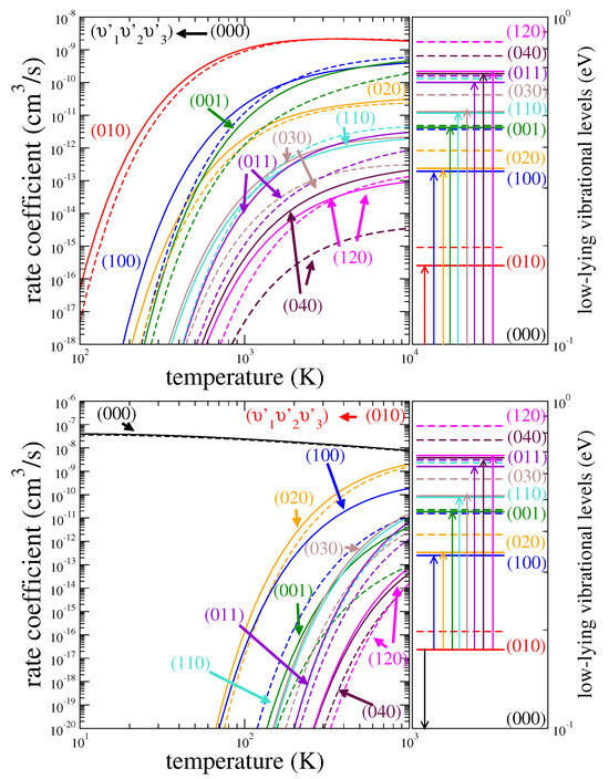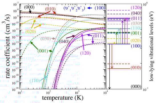 where and T are the Boltzmann coefficient and the temperature, respectively. Figure 8 and Figure 9 show examples of rate coefficients for initial levels (000), (010), (100), and (001). As for the cross sections, the largest rate coefficients are those for one-quantum (de-)excitations, and their differences with the H2O coefficients exceed a factor of 3 for some transitions.