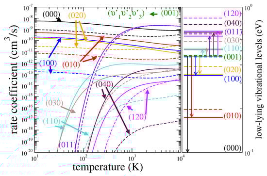 and the coefficients () are fitting parameters. The quantity is roughly the (de-)excitation probability for transition and is a smooth function of temperature. Figure 10 shows for a few transitions from the ground level to several final vibrational levels as a function of . In the above Equation (6), represents the threshold energy for the transition