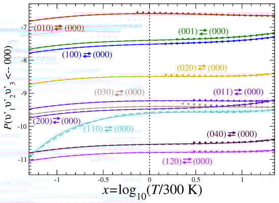To employ Formula (6) with fitted parameters given in Appendix A Table A1, Table A2, Table A3, Table A4, Table A5, Table A6 for each pair of transitions , the temperature T should be in kelvins. For instance, at K, the (de-)excitation probability reads as , because for T = 300 K (vertical dashed line in Figure 10).