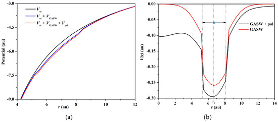 (a) Effective potential for the valence electron with of the confined ion: electrostatic (), GASW (), polarization (), and (b) a radial plot of the GASW potential with and without polarization for au.