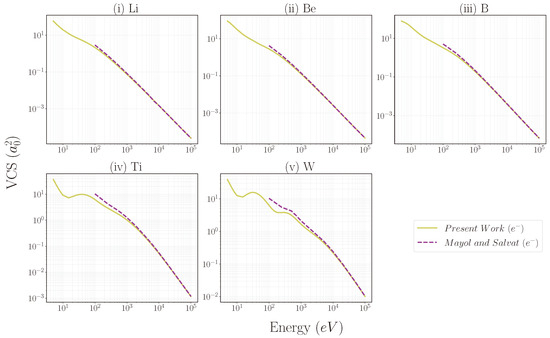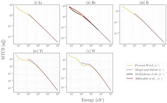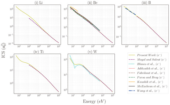 For the —Li, Be, B, Ti, and W scattering systems, we did not find experimental data in the literature to compare the present ICS, MTCS, and VCS calculations. We therefore compared the present results with the theoretical calculations shown in Figure 1, Figure 2 and Figure 3. Figure 1 shows the present result of the ICS for the —Li, Be, B, Ti, and W scattering systems. For all the elements, our data is compared with the theoretical results of Mayol and Salvat [10] in the energy range 100 eV ≤ ≤ MeV; for Be and W, the theoretical results are compared with Blanco et al. [12] in the energy range 5 eV ≤ ≤ 5000 eV and for B, the theoretical results are compared with Wang et al. [13] in the energy range 5 eV ≤ ≤ 100 eV. For Be the present results are compared with the theoretical predictions given by Adibzadeh et al. [15] in the energy range 5 eV ≤ ≤ 1000 eV, Fabrikant et al. [32] in lower energy range around 5–10 eV, Fursa and Bray [17] in the energy range 100 eV ≤ ≤ MeV, Kaushik et al. [16] in the energy range 5–30 eV and McEachran et al. [14] in the energy range 5 eV ≤ ≤ 5000 eV. The comparison shows that the present ICS results, in Figure 1, agree well with those of Mayol and Salvat [10], for all the atoms, and with Wang et al. [13], for B, throughout the compared energy range.