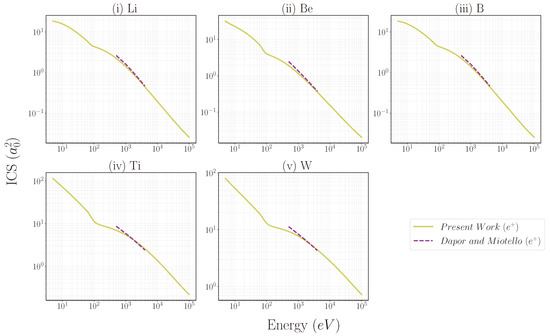 Distinct structures are clearly visible in the ICS, MTCS, and VCS curves for electron scattering. These features demonstrate that the —Li, Be, B, Ti, W interaction is significantly weaker than the —Li, Be, B, Ti, W interaction [33]. Specifically, the energy dependence of MTCS and VCS for electron scattering in the energy range 10 eV ≤ ≤ 100 eV exhibits a pattern of maxima and minima, which is not observed in positron scattering. This difference may be attributed to the variations in the interacting potentials between electron-atom and positron-atom systems. It should be noted that the static potential is repulsive and that there is no exchange potential for positron interaction [34].
