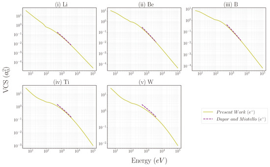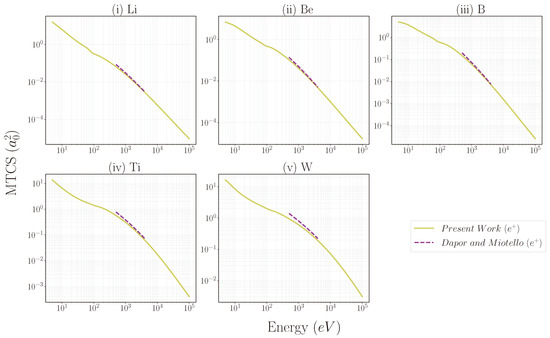 Figure 4, Figure 5 and Figure 6 depict the present results of ICS, MTCS, and VCS, respectively, for the —Li, Be, B, Ti, W scattering. For all elements, our data are compared with the theoretical results of Dapor and Miotello [11]. The comparison shows that the present ICS, MTCS and VCS results, in Figure 4, Figure 5 and Figure 6 are in good agreement with those of Dapor and Miotello [11] throughout their energy range. In the present case, all the cross sections are calculated over a wide energy range from 5 eV to 0.1 MeV. To our knowledge, currently, there are no experimental data available for ICS, MTCS, and VCS for the scattering of —Li, Be, B, Ti, and W. Therefore, there is a lack of data on positron scattering cross sections for these important plasma wall coating elements, and more research is needed.