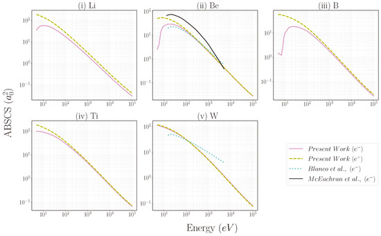 In Figure 7, we have presented the and scattering absorption cross sections (ABSCS) in the same figure together with the available comparisons. There are no experimental values available for ABSCS, but some theoretical calculations are available for the elements Be and W. As illustrated in Figure 7, the ABSCS which is the sum of excitation and ionization cross sections for electron scattering in the lower energy range, is lower for elements of lighter and intermediate weight such as Li, Be, B, and Ti compared to positron scattering. However, at higher energies, the cross-sections for electron and positron scattering converge. In contrast, for the heavier element W, the ABSCS for electron () and positron () scattering exhibit similar magnitudes and structures. We can also observe from Figure 7 that the probability of inelastic scattering for lighter elements rapidly reaches its maximum value at an electron impact energy of approximately 20 eV. This sudden increase could be attributed to resonant scattering phenomena which occur when the energy of the incident particle matches a specific energy level or resonance in the target. At this energy, the scattering cross-section can increase significantly, leading to a peak in the scattering probability [3]. The present results for ABSCS data for Be shows some disagreement at intermediate energies with the results of McEachran et al. [14], and for W atom, the present data shows slight disagreement with the results of Blanco et al. [12]. This may be because, for Be, they have used a relativistic complex optical potential (ROP) method to determine the cross-section and the polarized-orbital method is implemented to include the first seven multipole potentials [14], and for W, a corrected quasi-free absorption potential method is employed where the exchange potential was excluded from the complex potential [12].