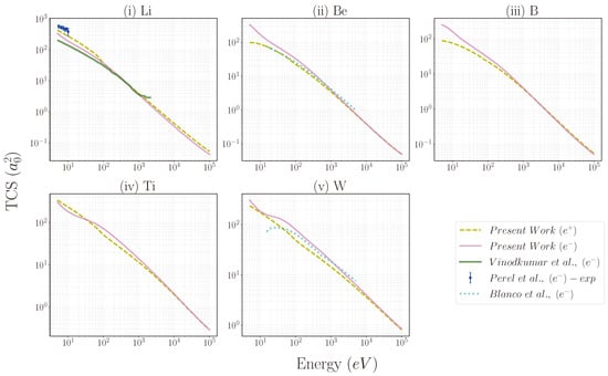 Figure 8 represent the present electron and positron collision TCS (elastic + inelastic) data for all the atoms, along with available comparisons. For the —Li system, where experimental total cross-section (TCS) data are available, we have carried out a direct comparison with our calculated results. The overall trend of the theoretical cross sections shows good consistency with the experimental data. However, minor discrepancies in magnitude are observed, particularly at very low incident energies. These deviations are likely attributed to the limitations of the current model in accurately capturing low-energy correlation effects, such as the formation of Ps-like interactions. Such effects are inherently challenging to describe without employing advanced methods, such as coupled-channel or close-coupling calculations. Also, for Li the present data are compared with the theoretical data given by Vinodkumar et al. [18] in the energy range 5 eV ≤ ≤ 2000 eV and for Be and W the present work is compared with the theoretical predictions given by Blanco et al. [12] in the energy range 15 eV ≤ ≤ 5000 eV. The TCS given by Blanco et al. [12] comprises ICS, ABSCS (excitation + ionisation), whereas our TCS data comprises ICS, MTCS, VCS, and ABSCS (excitation + ionisation). So, this may be the reason for the magnitude difference that is observed in Figure 8 for Be and W. We also notice that the TCS curves for scattering exhibit some structures, whereas these features are much shallower in the case of scattering. This variation indicates that the —Li, Be, B, Ti, and W interaction is considerably weaker compared to its electron counterpart [3].