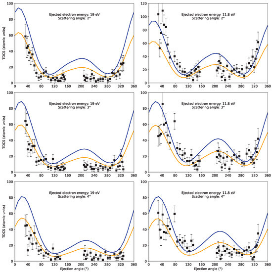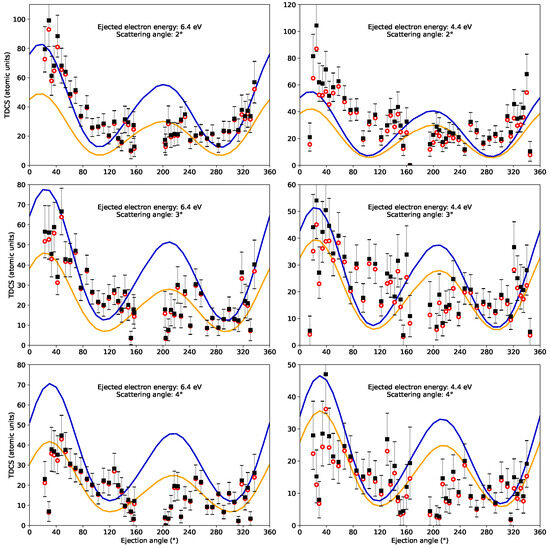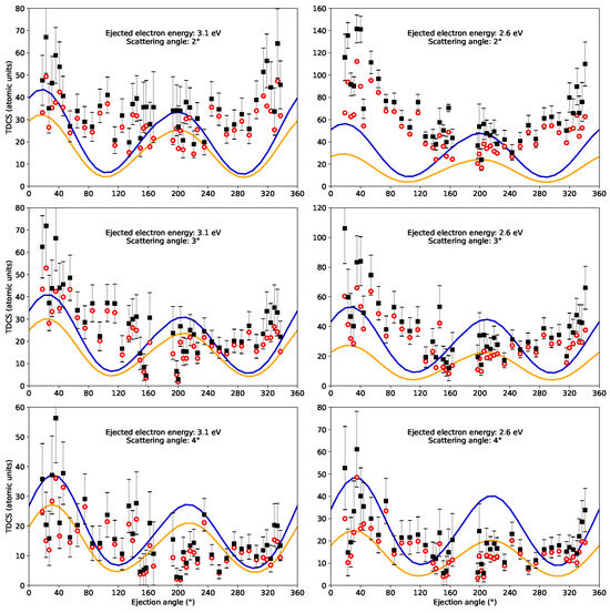 Figure 2 shows graphs for energies of 6.6 eV and 4.4 eV of the ejected electron. Here, in general, we have satisfactory agreement between the experimental data and the corrected statistics (red open circles). However, the quantitative agreement for the smaller angles in our convoluted results with the experimental data is worse, and our binary peak is below that found experimentally for the 2° scattering angle. For a larger scattering angle (4°), the agreement in the recoil peak is worse, but the agreement in the binary peak is quite good.