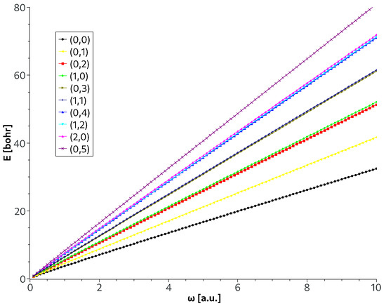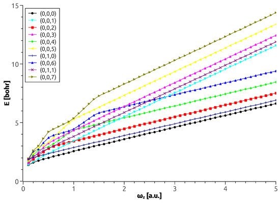 In Figure 4 we have the total energy, E, for different quantum states, , as a function of and fixing . We identified that, compared to the isotropic case, the band structure disappears when increases since the movement becomes governed by the harmonic potential whose associated energy spectrum has generally no degeneracy for values of n and .