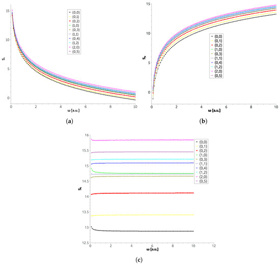 In Figure 2, in graphs (a) and (b), respectively, we have the values of informational entropies in the spaces of positions, , and momentum, , for different system states, , as a function of . In graph (c) we present the curves of versus . As expected, decreases with increasing confinement intensity (increasing values), on the other hand, the increases with increasing . This means that as the confinement becomes more intense, the uncertainty associated with the position measurements decreases. As also expected, in the excited state, the electrons are more weakly trapped by the harmonic potential. In turn, for more rigorous confinements (), the entropy sum becomes approximately constant. The entropic uncertainty relation (25), with , i.e., , is satisfied for the spherical artificial helium atom.