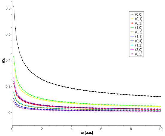 In Figure 1 we have the total energy, E, for different quantum states, , as a function of . It can be observed that the thin band structure appears when the confinement situation increases with the increase in the values. In fact, for large values of the influence of the Coulomb correlation of repulsion on the electrons is smaller and their movements begin to be mainly governed by the harmonic confinement potential, whose associated energy spectrum has degeneracies for some values of n and l, as seen in the expression (41). No avoided crossing is noticed, apparently, this is due to the spherical symmetry of the potential.