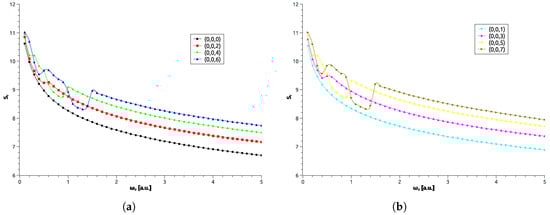 In Figure 6 we present the informational entropy in position space for different system states, as a function of with fixed. In the graph (a) we have versus for the even parity states and in the graph (b) versus is for the odd parity states, both with quantum number m = 0. For each graph, there are only avoided crossings in the energy curves (see Figure 4) and the observed abrupt changes in behavior of reflects this. We can see that in the ground state of each parity, namely and , there is no abrupt change in behavior in because these states do not have avoided crossings in the energy curves. On the other hand, in the first excited state of each parity, i.e., and , an abrupt change in occurs precisely at the location of the confinement value, , where the avoided crossing happens in the energy curves. In the other excited states of each symmetry, changes occur in more than one location, since there are several locations where avoided crossings happen in the energy.