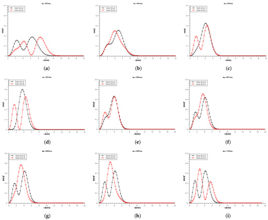 In order to analyze in more detail what occurs in the regions of avoided crossings, in Figure 7 we show the evolution of the radial density function of the second and third quantum states with even symmetry and , namely, states and , for different values of the confinement parameter (with ). We analyze the behavior in an interval . In this interval, we see in Figure 4 that the state has an avoided crossing with the state around and that, in turn, the state has other avoided crossings around and . Having observed Figure 5a and continuing the observation in Figure 7a, we see the states and evolve with two and three peaks, respectively. However, as Figure 7b,c shows, the radial density functions are deformed, since they are approaching the avoided crossing regions around , for states only, and , which acts as a kind of “barrier”. In Figure 7d, the radial density functions of the states and are found with one and two peaks, respectively. Then, following Figure 7e–i, we see that the state deforms in the sense of returning to having two peaks, since there is no other avoided crossing for this state. However, the state still does not return to having three peaks, since there is an avoided crossing with a higher state. Therefore, the state still feels a second “barrier” before continuing "freely" in the direction of increased confinement. In Figure 5b we see that the state returns to having three peaks well after passing through the second “barrier”. Therefore, the sudden changes in the behavior of the position entropy reflect the presence of this “barrier” encountered throughout the variation in quantum confinement.