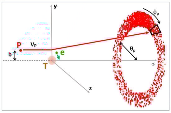 Geometry and scattering kinematics for fast positron ionization. P: projectile approaching in yz plane with velocity Vp and impact parameter b and scattering at laboratory angle θp. Only the arrow for “normal” scattering is shown. T: target core at origin. e: Ar(3p) electron in spherical shell determined by microcanonical ensemble. The red ring shows scattering events in an xy plane where the ring radius and width are θp and Δθp. The black polygon contains events for a scattering solid angle defined by θp ± Δθp and ϕp ± Δϕp. Events for positive y are for “normal” scattering; events for negative y are for “reverse” scattering.
