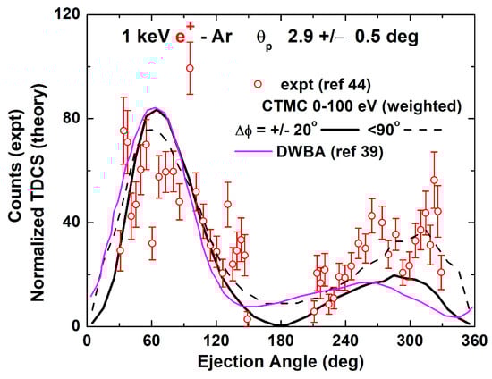 The present work investigates a smaller scattering angle, e.g., 2.9°, where experimental [] and theoretical [,] data are available and the momentum transfer is approximately 1/3 atomic unit. In order to compare our CTMC predictions with the experimental data which consisted of a broad ejected energy distribution, we calculated TDCS probabilities for a number of energy bins between 0 and 100 eV, e.g., 0.1–1, 1–5, 5–10, and 10 eV bins between 10 and 100 eV. This was performed using the quoted experimental azimuthal angle acceptance ranges. Weighted contributions from each of these energy bins were determined using the experimental energy distribution. These were summed to generate the TDCS spectrum shown by the solid black curve in Figure 2. Note that this curve represents in-plane scattering where the difference in the azimuthal angles is less than the sum of the quoted values. For comparison with the experimental data, rather than using a normalization at some arbitrary angle, the binary area between 30 and 150 degrees was used. Although the experimental data are subject to scatter, the agreement in the binary region is good; in particular, the experimental and CTMC predicted centroids and widths agree quite well. In the recoil region, the experimental and CTMC shapes are very similar, but the experimental magnitudes are roughly a factor of two larger. We note that, in general, the data points and error bars of the classical results are obtained for values calculated for the contributing energies within energy bins centered on each data point.