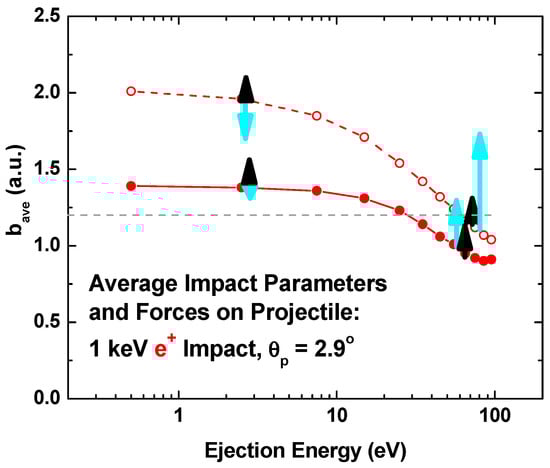Average impact parameters for “normal” and “reverse” positron scattering as functions of ejected electron energy (filled symbols and solid curves, open symbols and dashed curves, respectively). The arrows show the relative maximum forces on the projectile due to the target core (black arrows) and by a 3p electron (blue arrows). As in Figure 1, the 3p electron is positioned on the y-axis at the centroid of the Ar(3p) charge distribution, shown here by the dashed line.