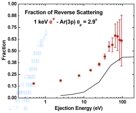 In Figure 5, our CTMC predictions for reverse scattering are shown as a function of the ejected electron energy (the filled red symbols). Again, the scattering angle is 2.9 ± 0.5 degrees, where the momentum transfer is approximately 1/3 a.u. For comparison, the black curve shows the fractions for a 10° scattering angle where the momentum transfer is ~1 a.u. There are similar systematic increases in energy transfer in both cases. These two sets of data imply a systematic decrease in the importance of “reverse” scattering for larger scattering angles.
